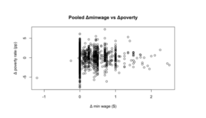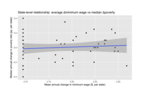 I also examined longer-run relationships by comparing minimum-wage levels and poverty rates within states over time, while accounting for national trends. This analysis shows no meaningful association either. States with higher minimum wages do not systematically have lower poverty rates once long-standing state differences and overall economic conditions are taken into account.