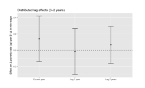 I also tested whether minimum-wage increases affect poverty with a delay, rather than immediately. To do this, I looked at changes in poverty over the following two years after a wage increase and added them together to measure the total effect. The result is still very small and not statistically reliable: over three years, a $1 increase in the minimum wage is associated with about a 0.2 percentage point increase in poverty, but this estimate is indistinguishable from zero.