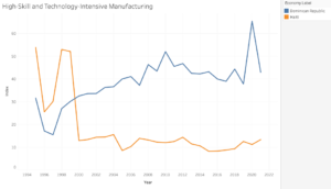 Looking specifically at the high-skill technology-intensive manufacturing, we see a starker difference. The Dominican Republic slowly built up its high-skill technology-intensive manufacturing while Haiti lost their high-skill technology-intensive manufacturing. Haiti has yet to regain any semblance of the dominance it had on the high-skill technology-intensive manufacturing advantage it had over the Dominican Republic.