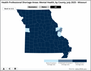 Figure 2: Mental health professional shortage areas in Missouri in 2025 – the problem persists. Light blue areas indicate St. Louis and Kansas City metro areas. Source: ruralhealthinfo.org