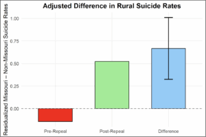 Figure 1: Residual difference in rural suicide rates between Missouri rural counties and non-Missouri rural counties, after adjusting for year and state fixed effects. The right-most bar represents “difference-in-differences;” 95% confidence interval shows that the difference between post- and pre- repeal is significantly different from zero.