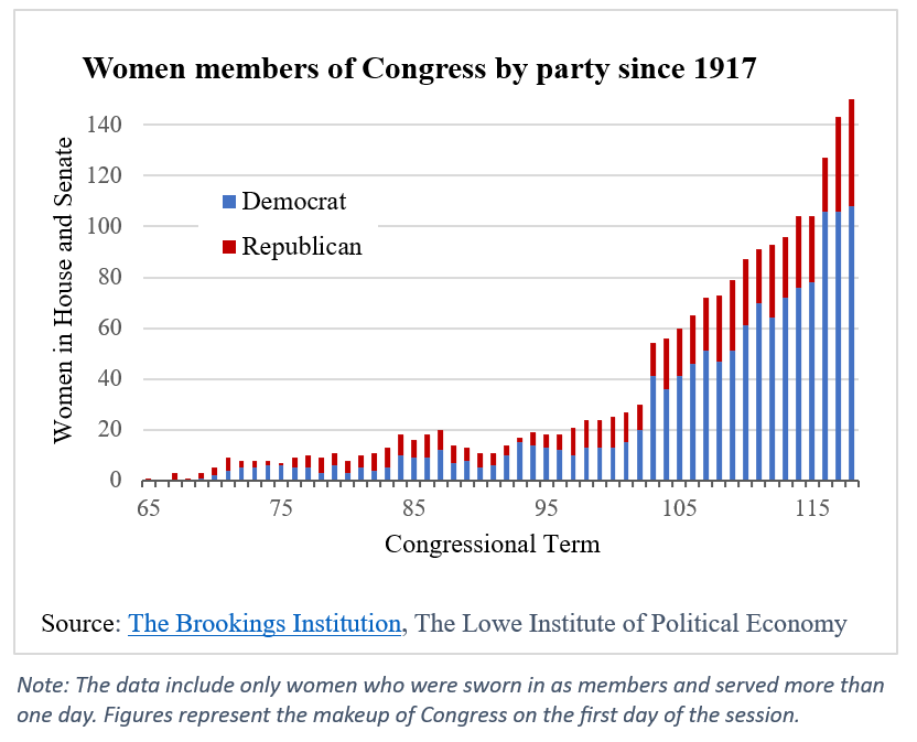 While female representation has grown substantially since the election of the first woman to Congress in 1917, females still only make up about a quarter of the legislature – significantly less than their share of the American population. Still, the current Congress brings the highest number of women to date and the greatest racial diversity the legislature has seen. The 2024 Congressional election will tell whether the low female election rate in the South and Republican Party continue or reach a turning point.