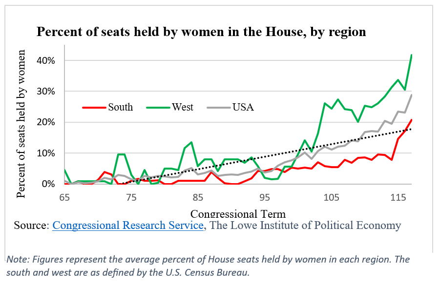 For almost one hundred years southern states have elected women to the House at lower rates than the U.S. overall. The gap began in 1933 and has increased, on average, by 2% every ten years. Currently the proportion of Congresswomen in the south lags 8% behind the national proportion of female representatives.